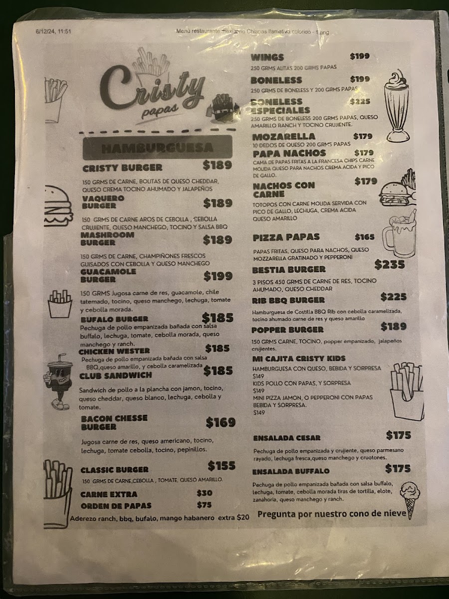 Overall, Cristy Papas Centro perfectly blends delectable cuisine with a warm, engaging atmosphere. If you seek a place to indulge in superb burgers and create cherished memories with loved ones, there’s no better dining destination in Nogales. I wholeheartedly recommend giving this local hotspot a visit — you’ll leave with a satisfied palate and a smile!